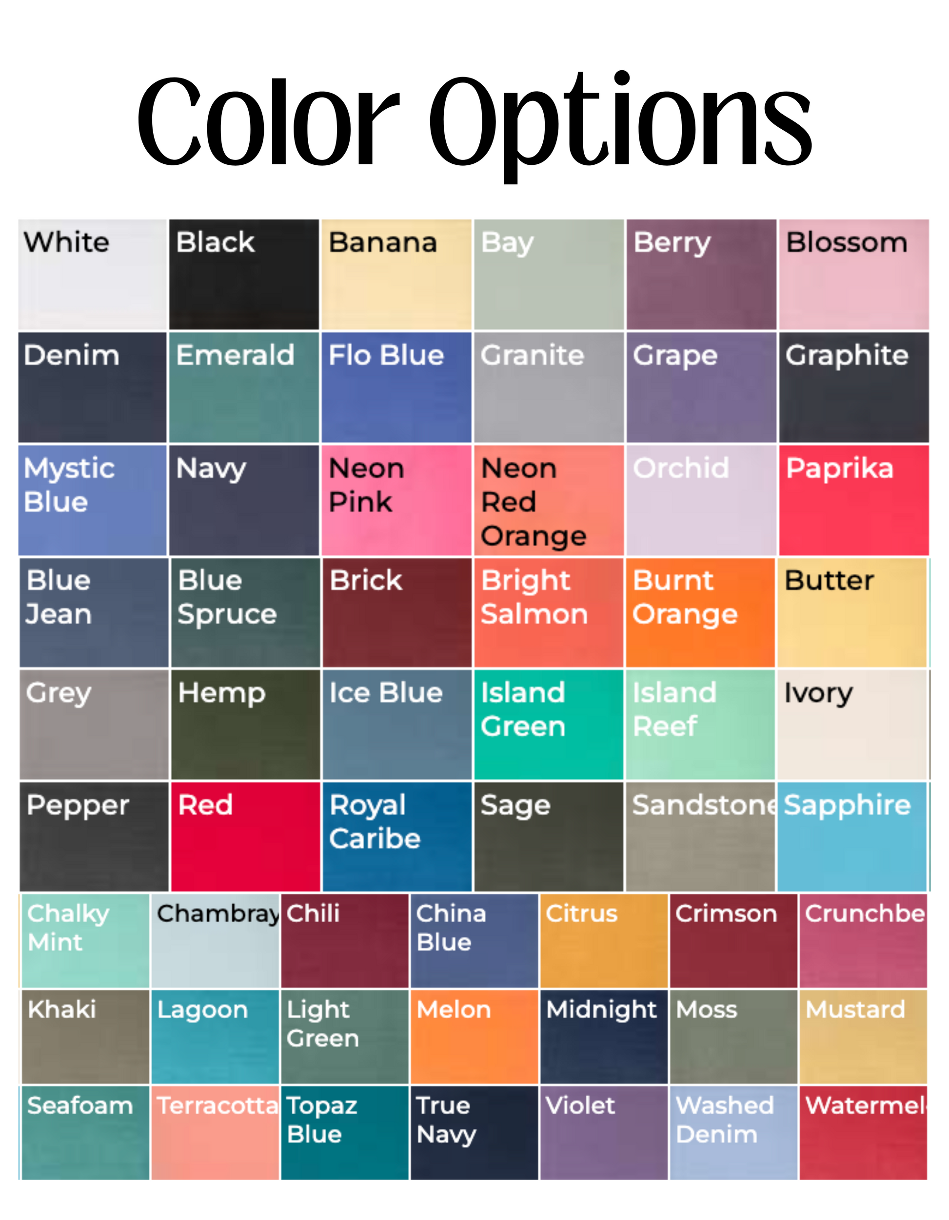 Shade variations are inherent in the pigment dye process. Pigment dye colors: These colors provide a vintage look that will remain for the life of the garment. Pigments are insoluble color particles attached to the surface of cloth using a binding agent. Reactive dye colors: Provide a traditional dyed appearance, with the same great softness.