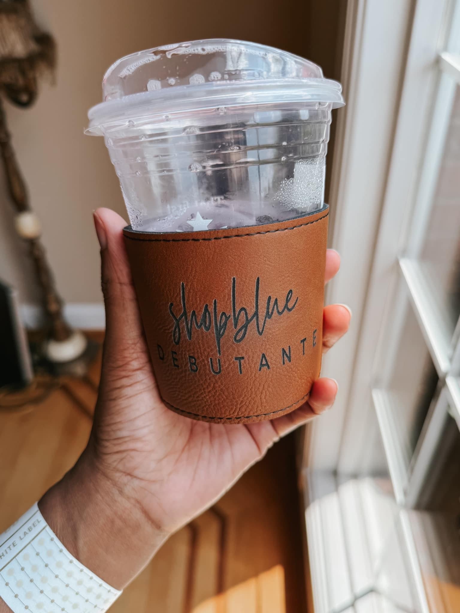 Personalized leatherette cup sleeves. Comes in a light brown and dark brown